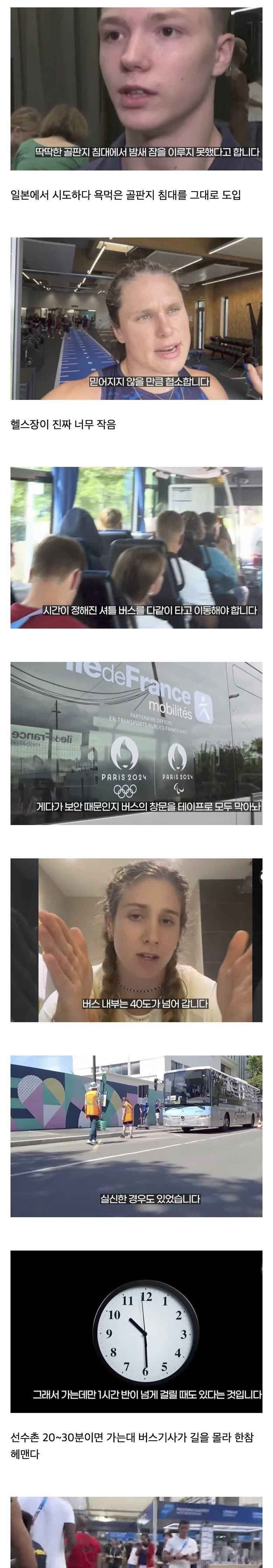 최근 열린 프랑스 파리 올림픽이 여러 문제로 인해 역대 최악의 대회로 불리고 있습니다. 선수들은 딱딱한 골판지 침대에서 밤새 잠을 이루지 못했으며, 협소한 헬스장과 정해진 시간에만 운행되는 셔틀 버스로 인해 불편을 겪고 있습니다. 특히, 보안 문제로 인해 버스 창문이 테이프로 막혀 내부 온도가 40도를 넘어 실신하는 경우도 발생했습니다.