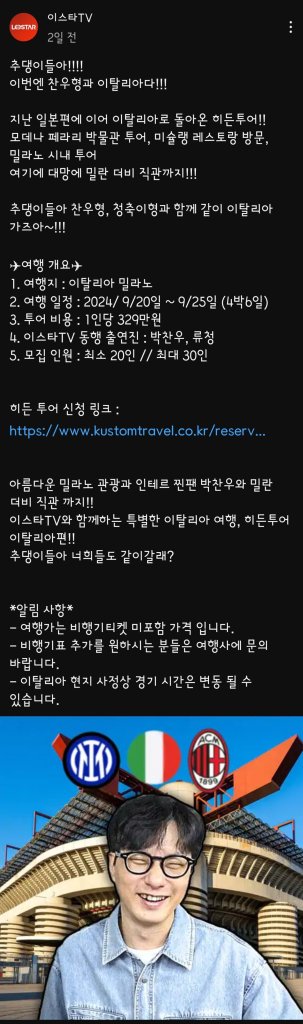 유명 축구 유튜브 채널인 ‘이스타TV’가 기획한 히든투어 이탈리아 세리에A 밀란 더비 직관 여행 상품이 축구 팬들 사이에서 큰 논란을 일으키고 있습니다. 랩추종윤(박종윤)과 이주헌 대표가 운영하는 이스타TV는 지난 6일, 팬들을 대상으로 하는 밀란 더비 직관 상품을 출시했지만, 가격과 구성에 대한 비판이 이어지고 있는 상황입니다.