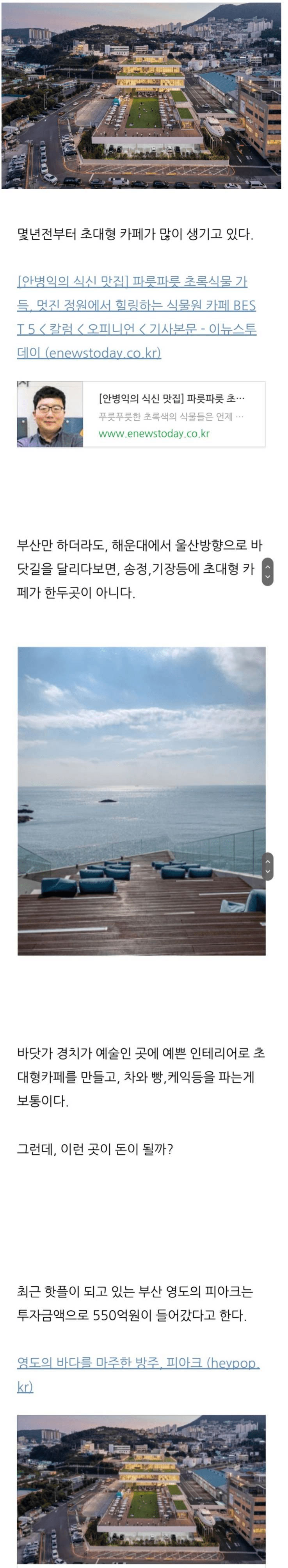 몇 년 전부터 전국적으로 초대형 베이커리 카페가 우후죽순으로 생기고 있어요. 부산만 해도 송정, 기장, 영도 등에 해변을 배경으로 멋진 대형 카페들이 자리 잡고 있죠. 이런 대형 카페들은 건물부터 인테리어까지 막대한 투자 비용이 들어가는데, 그럼에도 불구하고 계속해서 증가하고 있는 이유가 무엇일까요?
