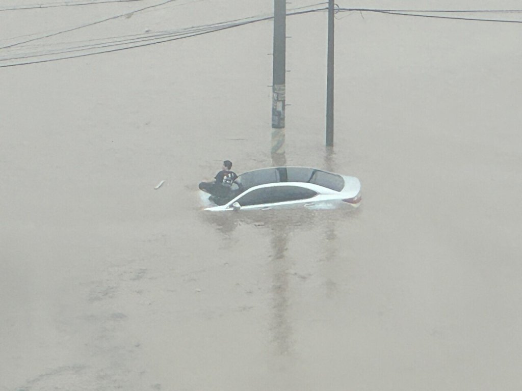 최근 경남 김해에 집중호우가 쏟아지면서 한 남성이 차량 위에 고립된 모습이 포착돼 온라인에서 화제가 되고 있습니다.