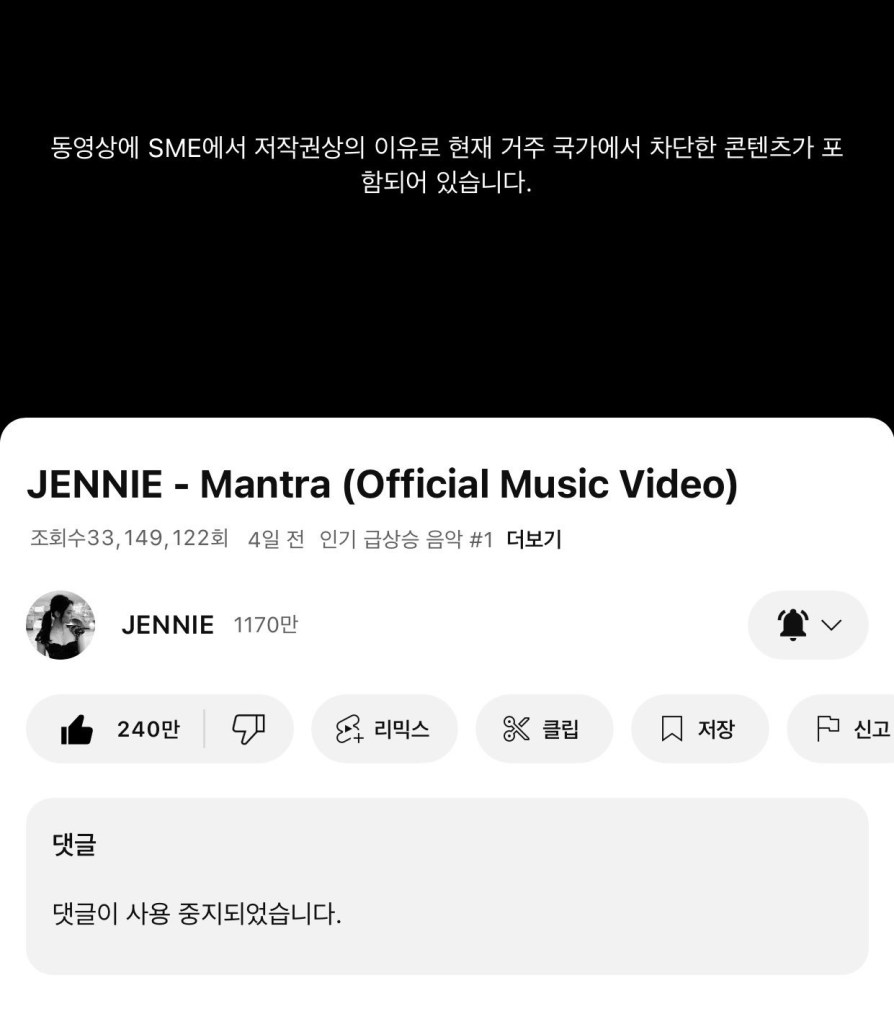 제니 신곡이 유튜브에서 정지 된 이유