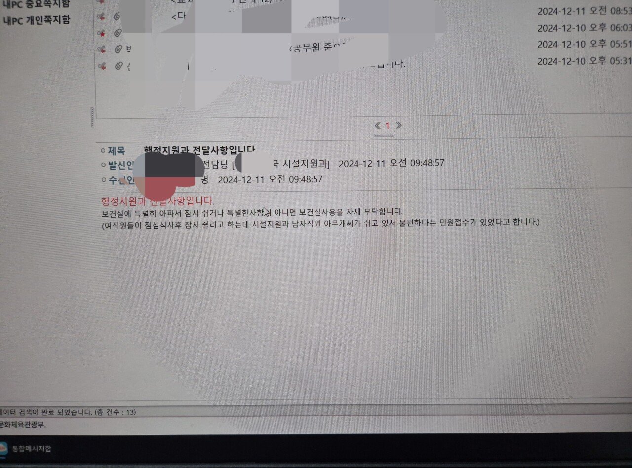 “보건실에 특별히 아파서 잠시 쉬거나 특별한 사항이 아니면 보건실 사용을 자제 부탁합니다. 여직원들이 점심식사 후 잠시 쉬려고 하는데, 시설지원과 남자 직원 아무개 씨가 쉬고 있어 불편하다는 민원이 접수되었습니다.”