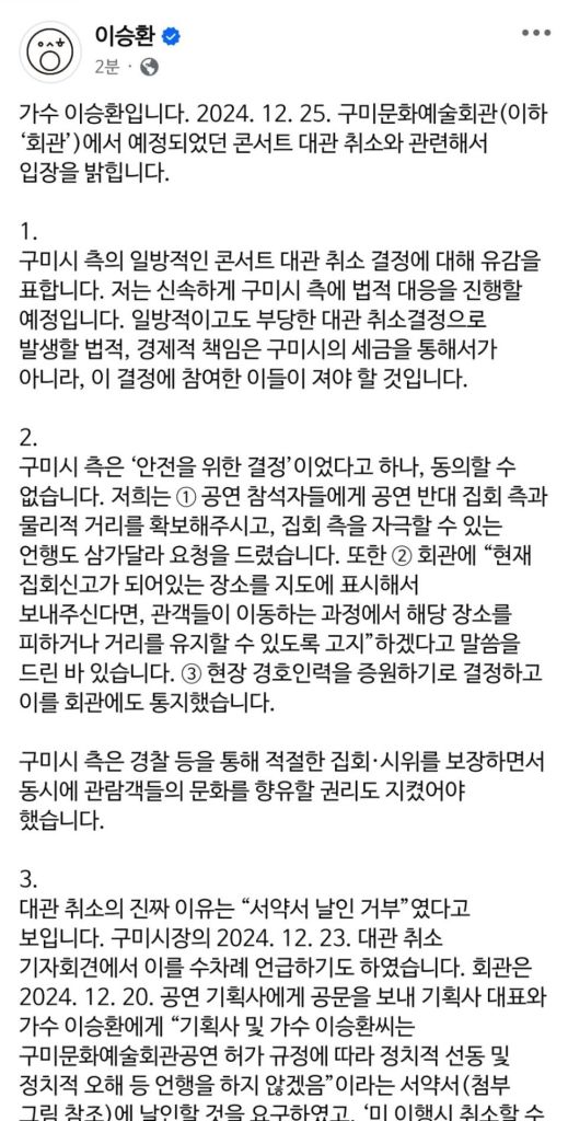 이승환 씨는 오는 2024년 12월 25일, 구미문화예술회관에서 콘서트를 개최할 예정이었으나, 구미시의 일방적인 대관 취소 결정으로 공연이 무산되었습니다. 이에 대해 이승환 씨는 “부당한 취소 결정으로 법적 대응을 진행하겠다”고 밝혔으며, 구미시의 결정에 대해 강력히 유감을 표했습니다.