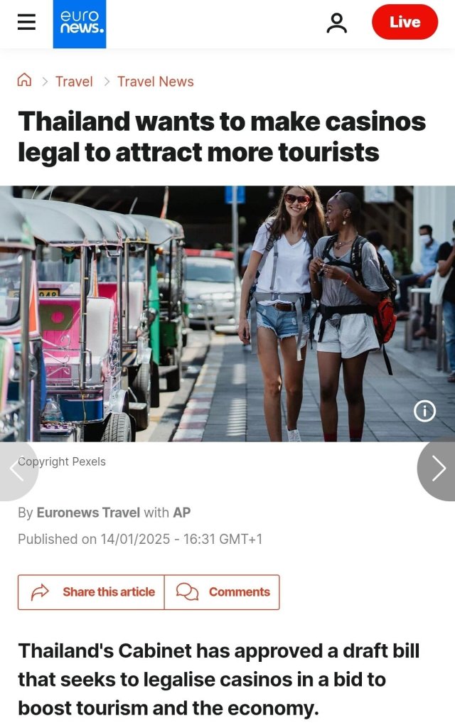 태국이 마침내 ‘카지노 합법화’라는 초강수를 두고 있어 화제입니다. 한때 연간 4천만 명이 넘는 관광객이 찾았던 태국은, 관광산업이 GDP의 20%를 차지하고 외국인 관광객이 쓰고 가는 돈만 해도 GDP의 12%에 달할 정도로 ‘관광’ 하나로 먹고사는 나라예요. 하지만 코로나 이후인 2023년, 관광객 수가 2천800만 명 수준으로 줄어들면서 예전만큼 경제가 살아나지 못하자 결국 카지노 합법화 카드까지 꺼내 든 것이지요.