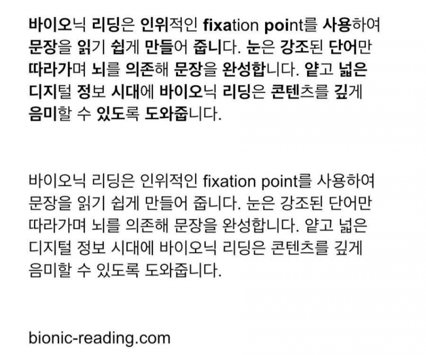 최근 ‘바이오닉 리딩(Bionic Reading)’이라는 독특한 독서 방식이 화제가 되고 있습니다. 이는 인위적인 fixation point(고정점)를 문장 내 특정 부분에 적용해, 독자의 시선이 강조된 단어나 글자를 따라가도록 유도하는 속독 기법인데요. 이 방식으로 글을 읽으면, 우리의 뇌가 빠르게 단어를 인식하고 문장을 완성해 주기 때문에 ‘빠른 속도 + 정확한 이해도’를 동시에 얻을 수 있다고 해요.