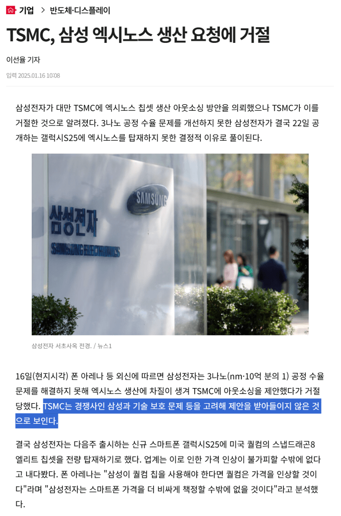 TSMC, 삼성 엑시노스 생산 요청 거절…갤럭시S25 전량 스냅드래곤 탑재?