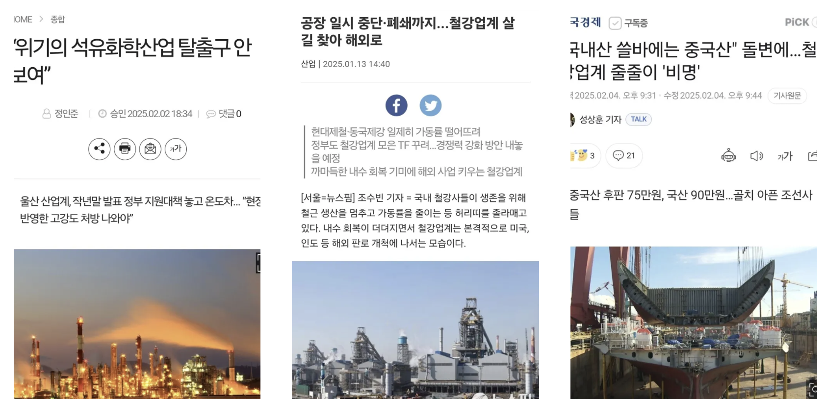 최근 한국의 전통적인 제조업 분야가 하나같이 고전을 면치 못하고 있습니다. 조선업부터 철강·석유화학에 이르기까지, 중국산 상품의 품질이 크게 올라온 데다 가격 경쟁력까지 뛰어나면서, 국내 업체들이 점점 설 자리를 잃고 있다는 지적이 나오는데요. 실제 각 업계의 상황을 살펴보면 그 위기감이 고스란히 전해집니다.