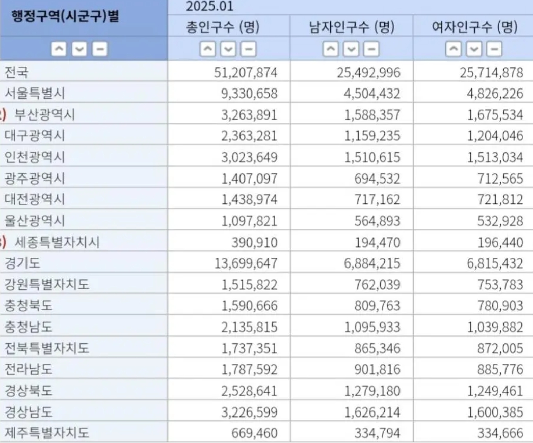 2025년 1월 기준 행정구역별 인구 통계에 따르면, 수도권 총인구는 26,053,954명으로 전체 인구(51,207,874명)의 **50.9%**를 차지했다. 이는 수도권 집중화 현상이 더욱 심화되고 있음을 보여주는 지표다.