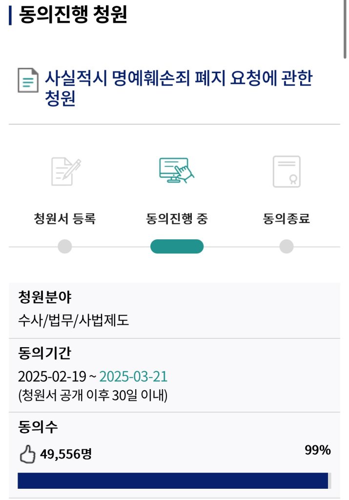 사실적시 명예훼손 폐지 청원, 국회 동의 99% 돌파