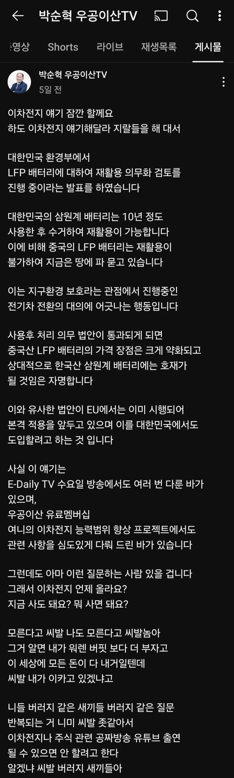 #박순혁 #우공이산TV #배터리아저씨 #이차전지 #LFP배터리 #삼원계배터리 #전기차배터리 #주식유튜브논란 #우공이산