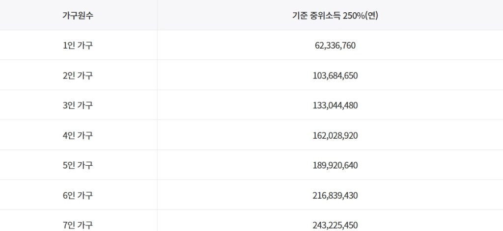 | 가구소득 | 기준 중위소득 250% 이하 |