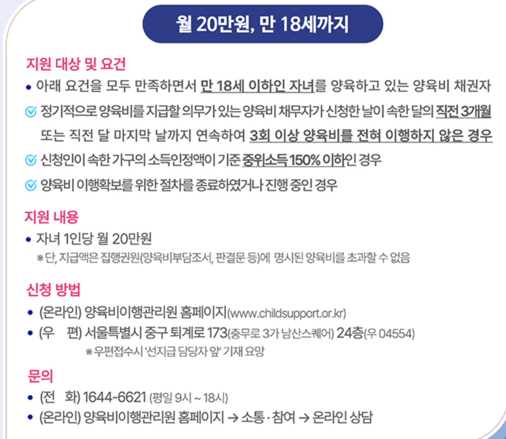 (단, 양육비 채무자가 직접 20만 원 이상 지급 시 해당 월 지원 중단)