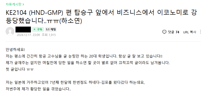 비즈니스에서 이코노미로 강등? 대한항공 KE2104편에서 벌어진 황당한 사연