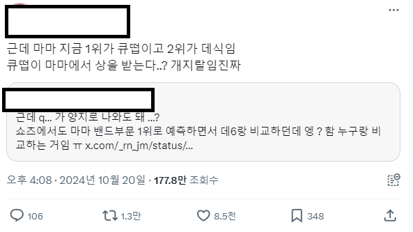 빠순이들이 데이식스를 밀어주려는 이유 빠순이들이 데이식스를 밀어주려는 이유#마마밴드부문 #데이식스 #큐떱논란 #음악시상식 #빠순이들 최근 음악 시상식 마마(MAMA)에서 밴드 부문 1위 후보에 올라있는 두 그룹이 큰 화제를 모았습니다. 현재 1위는 ‘큐떱’, 2위는 ‘데이식스’인데, 큐떱의 마마 수상이 예측되면서 온라인 커뮤니티에서 팬들 사이에 큰 논란이 되고 있습니다.https://kekewo.net/%eb%8d%b0%ec%9d%b4%ec%8b%9d%ec%8a%a4-qwer 빠순이들이 데이식스를 밀어주려는 이유 - 케케우#마마밴드부문 #데이식스 #큐떱논란 #음악시상식 #빠순이들kekewo.net 이슈 2024.10.22