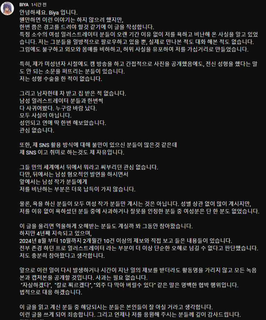 일부 여성 일러스트레이터, Biya에 대한 허위사실 유포 논란 일부 여성 일러스트레이터, Biya에 대한 허위사실 유포 논란#허위사실유포 #Biya #일러스트레이터 #사이버폭력 #법적대응 최근 일러스트레이터 Biya가 일부 여성 일러스트레이터들이 자신에 대해 근거 없는 비난과 허위사실을 퍼뜨렸다는 내용의 글을 올려 논란이 되고 있다. Biya는 그동안 이러한 비난에 대해 공개적으로 언급하지 않았지만, 지속적인 비난과 거짓 소문이 이어지자 결국 경고문을 작성했다.https://kekewo.net/biya 일부 여성 일러스트레이터, Biya에 대한 허위사실 유포 논란 - 케케우#허위사실유포 #Biya #일러스트레이터 #사이버폭력 #법적대응kekewo.net 이슈 2024.10.22