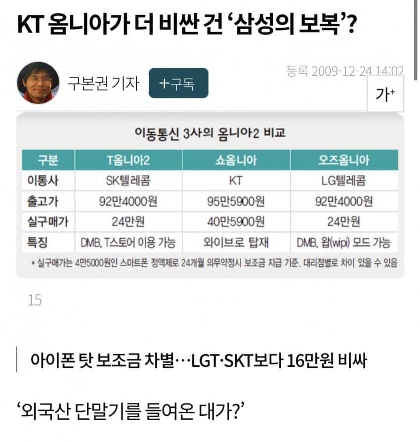 2009년, KT는 애플의 아이폰을 국내에 단독으로 도입하려는 계획을 세웠습니다. 그러나 당시 삼성은 자사의 스마트폰인 옴니아를 출시하고 있었기 때문에 아이폰의 국내 진출에 대해 우려를 표명했습니다. 이로 인해 삼성은 아이폰의 국내 도입을 반대하며 방해하는 움직임을 보였다고 전해집니다.