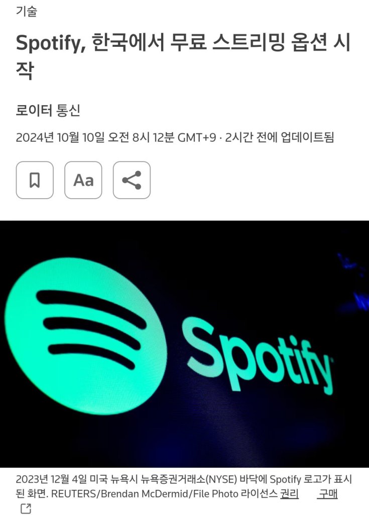 스포티파이(Spotify)가 한국에서 무료 스트리밍 서비스를 시작했습니다. 2024년 10월 10일, 로이터 통신을 통해 스포티파이는 한국에서도 무료 음악 및 팟캐스트 서비스를 제공한다고 밝혔습니다. 이로써 한국 사용자들도 광고를 보는 대신 무료로 음악을 즐길 수 있는 옵션을 가지게 되었습니다.