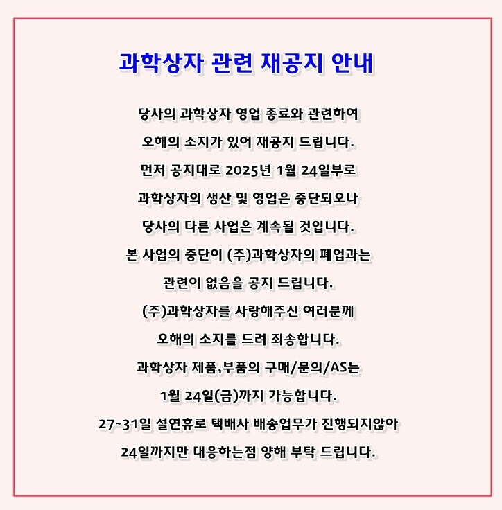 최근 ‘과학상자’가 사라진다는 소식이 전해져, 많은 분들이 “정말 회사가 문을 닫는 건가요?”라며 놀라셨을 텐데요. (주)과학상자 측에서 재공지를 통해, 회사는 폐업하지 않고 다른 사업을 이어갈 예정이라고 밝혔습니다. 다만, 2025년 1월 24일부터 과학상자 제품 생산 및 영업을 중단하게 되어, 해당 브랜드에 대한 구매 및 AS는 1월 24일까지만 진행된다고 하네요.