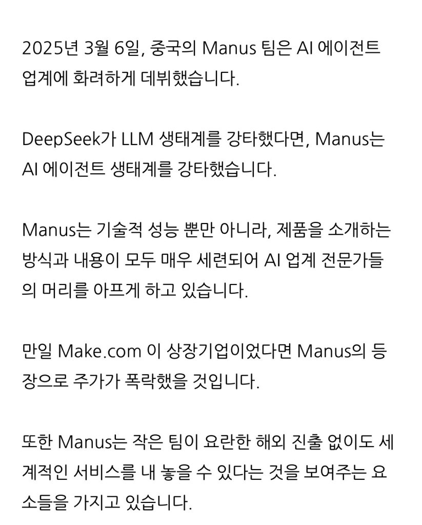 지난 3월 6일, 중국의 AI 개발팀 Manus가 AI 에이전트 업계에서 강렬한 데뷔를 알렸다.